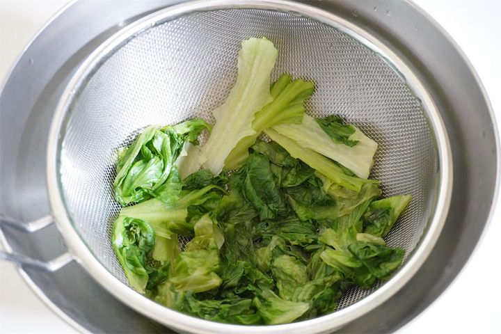 4. グリーンリーフ6枚をちぎって水にさっと浸してアクを抜き、軽く茹でて水気を絞る。