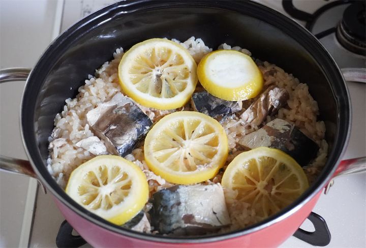 炊き上がりました!レモンとサバのおいしそうな香りが広がります。