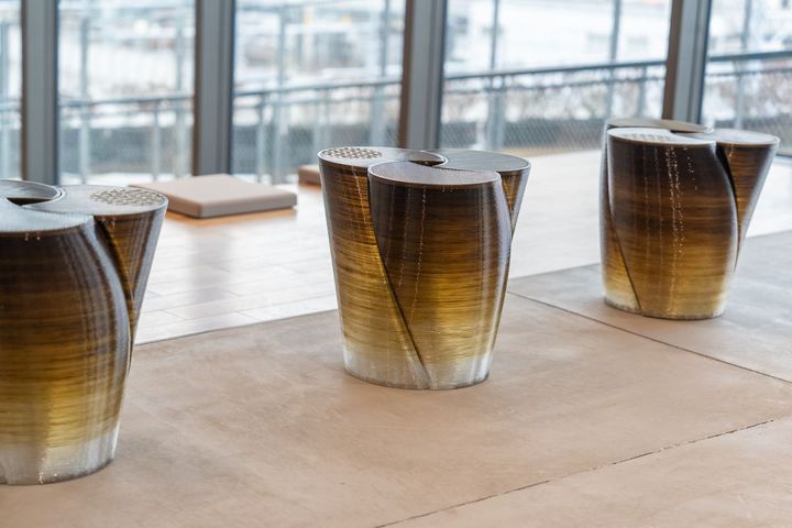 ちなみに施設内のところどころに配されたベンチなどのインテリアは、元高輪築堤の廃材を使用したものなど、それぞれに物語があります。写真のベンチは2025年日本国際博覧会(大阪・関西万博)日本政府館(日本館)に展示された、3Dプリンタが藻類とバイオプラスチックを混ぜ合わせた特殊な素材で作られた「藻類スツール」。ぜひ館内で探してみてはいかがでしょうか。