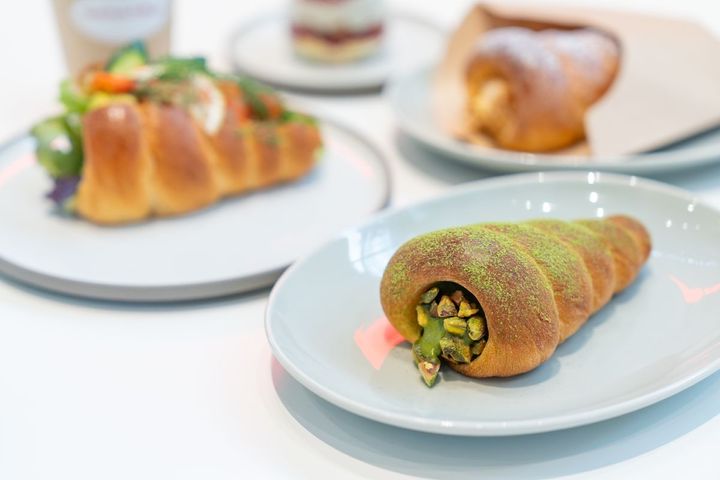 隈研吾氏がデザインした「MoN Takanawa: The Museum of Narratives」の外観ファサードをイメージした4種のコロネが看板メニュー。「抹茶とピスタチオクリーム スパイラルコロネ」800円といったスイーツ系や、「アボカドとサーモンのスパイラルコロネ」1100円といった惣菜系のコロネが揃います。カウンター席にはコンセントもあるので、ゆっくりカフェ時間を満喫できそうです。