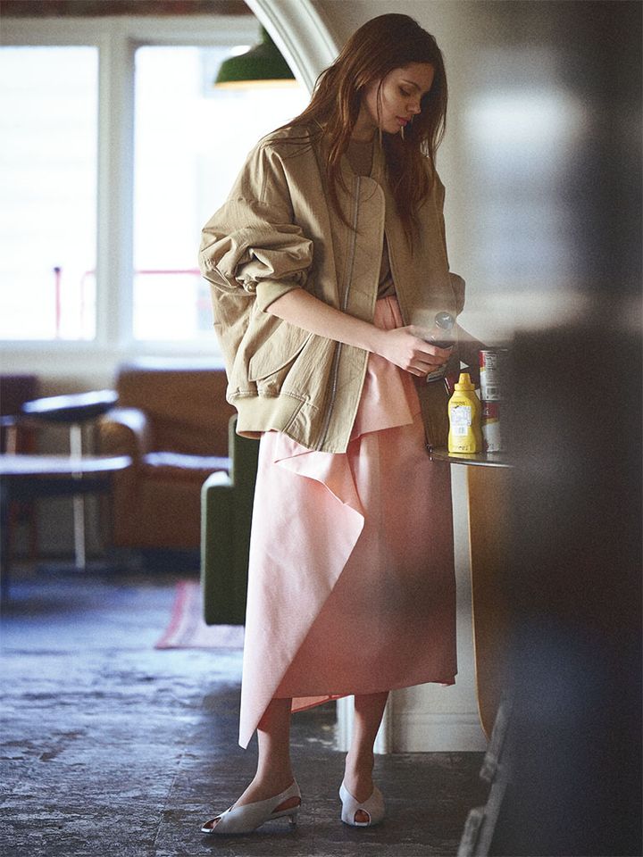 華奢さが引き立ち、気だるさを演出する丸みを帯びたオーバーサイズ。まろやかなベージュの上品さがMA-1のタフさを和らげ、ちょうどいいメンズっぽさに着地。サテンスカートやパステルカラーの甘さになじみつつ、辛口なエッセンスも加えられる品のいいくずし役。