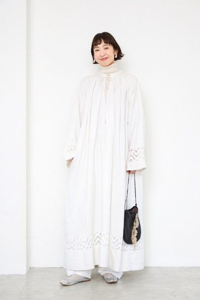 繊細なレースが施されたビンテージのドレスに、白のアイテムを重ねた統一感のある保谷さんの着こなし。