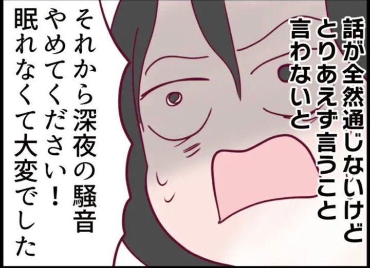 マルコさんが人から聞いた話にフィクションを加えて漫画化した「怖すぎる隣人」。夫は帰ってきたが、泥酔していて頼りにならない。眠れない夜を過ごし、翌朝、絶対に隣の女に文句を言ってやると決めた。