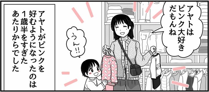 「新しいパジャマ、どっちがいい?」私がふたつのパジャマを広げると、アヤトは迷うことなく指でピンクの方を指しました。アヤトがピンクを好むようになったのは、1歳半を過ぎたあたりから。最初はたまたまかと思っていましたが、色鉛筆で絵を描くときも、お出かけの靴も、アヤトが選ぶのは決まってピンク。