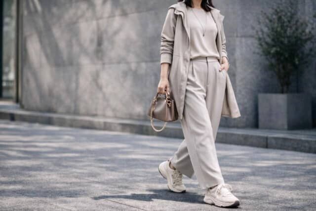 例えば、ゆるめのパンツやロング丈のスカートに細いパンプスを合わせると、足元だけが浮いた印象に。ほんの少し厚みや存在感のある靴に変えるだけで、コーデ全体が自然と整って見えるようになります。
