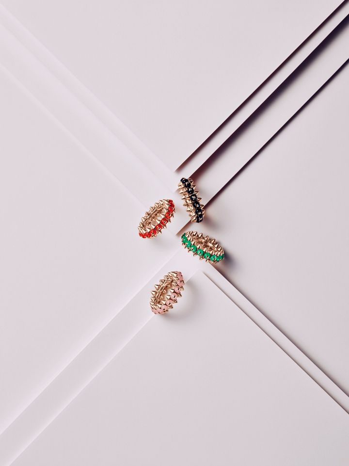 カラーストーンのビーズは中央に穴を空けて、クル ドゥ パリと呼ばれる四角錐のパーツでねじ止め。丸、三角、四角と3つの形がバランスよく正確に配置され、“クラッシュ ドゥ カルティエ”ならではのジオメトリックな魅力を際立たせています。リングのほか、イヤリングとペンダントも展開。