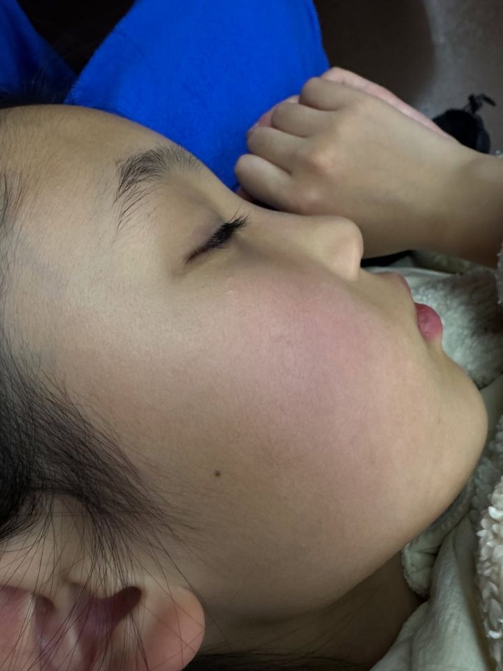 移動中に寝てしまい、じっくり観察した娘の頬。本来の健康な肌はツヤツヤではなくサラサラ! そして自然な血色って実はピンク。