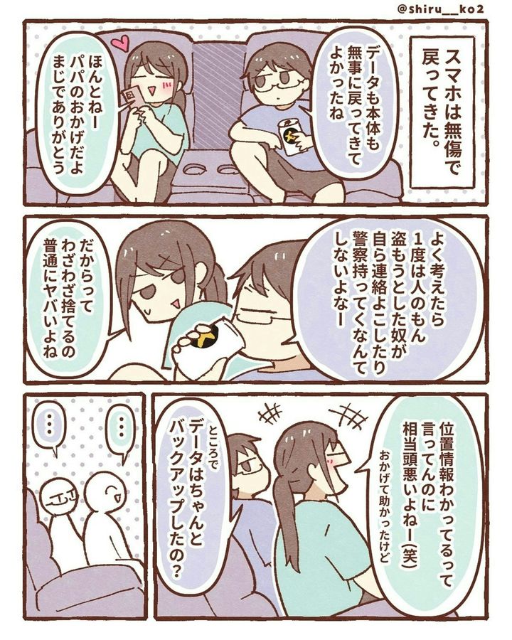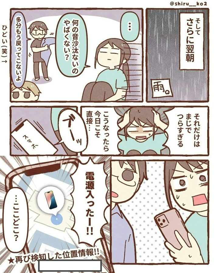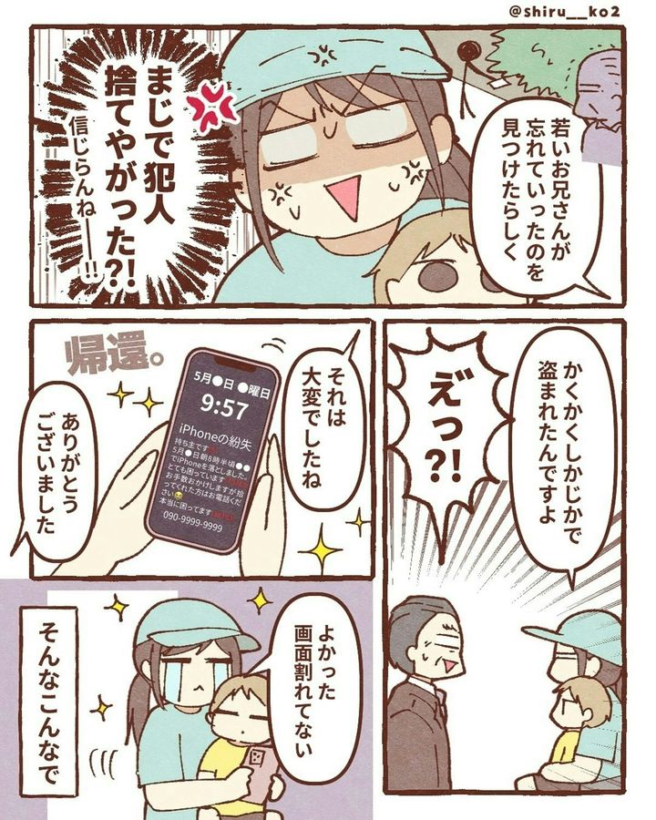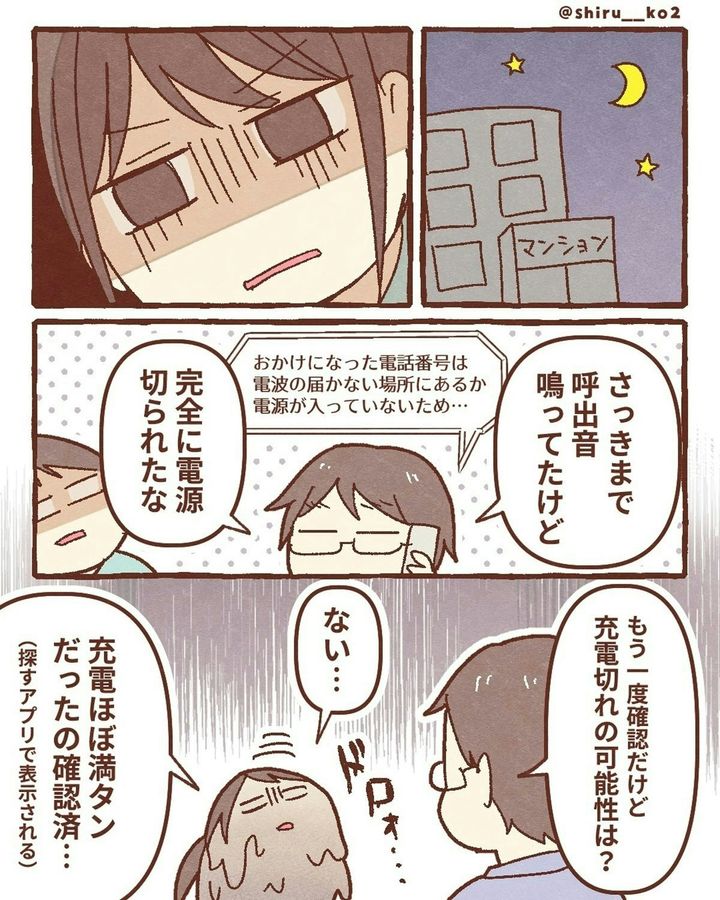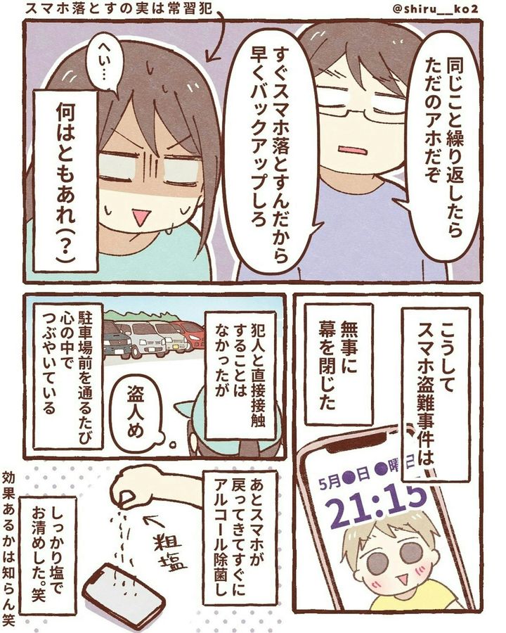 このお話は、著者・しる子(@shiru__ko2)さんがスマホを落としてしまったときの実体験が描かれています。ある日、息子と一緒に公園へ出かけた際、途中の道でスマホを落としてしまいます。探しに戻りますが、見つけることができませんでした。次に、しる子さんは「iPhoneを探す」機能を駆使し、スマホの場所を特定。GPSが示した場所は近所の駐車場でした。その後、夫が夜の駐車場に張り込み。果たして、しる子さんのスマホは…。『スマホ盗まれた』をダイジェスト版でごらんください。