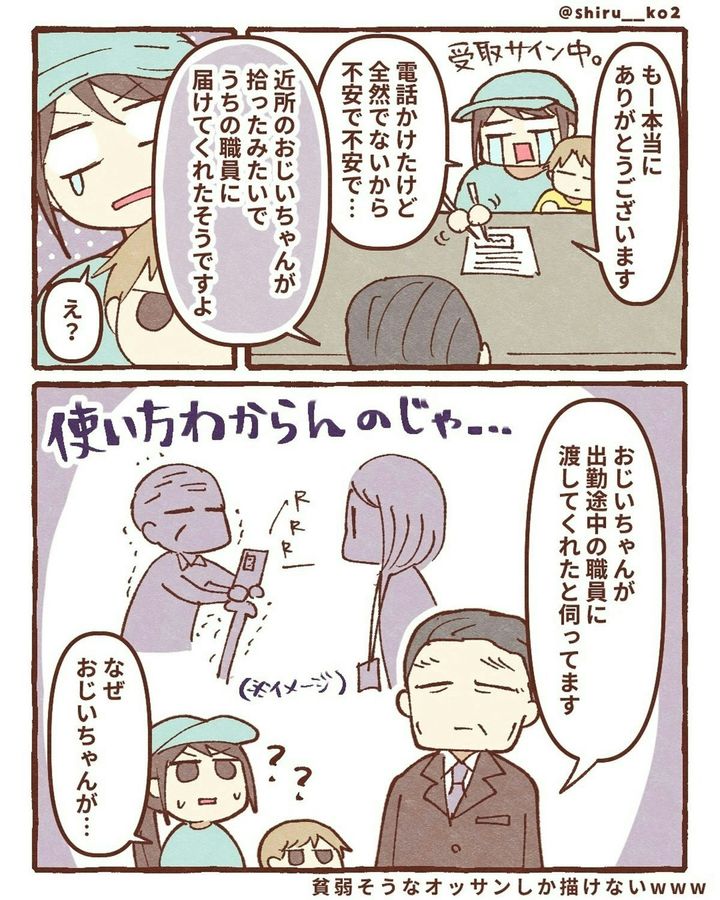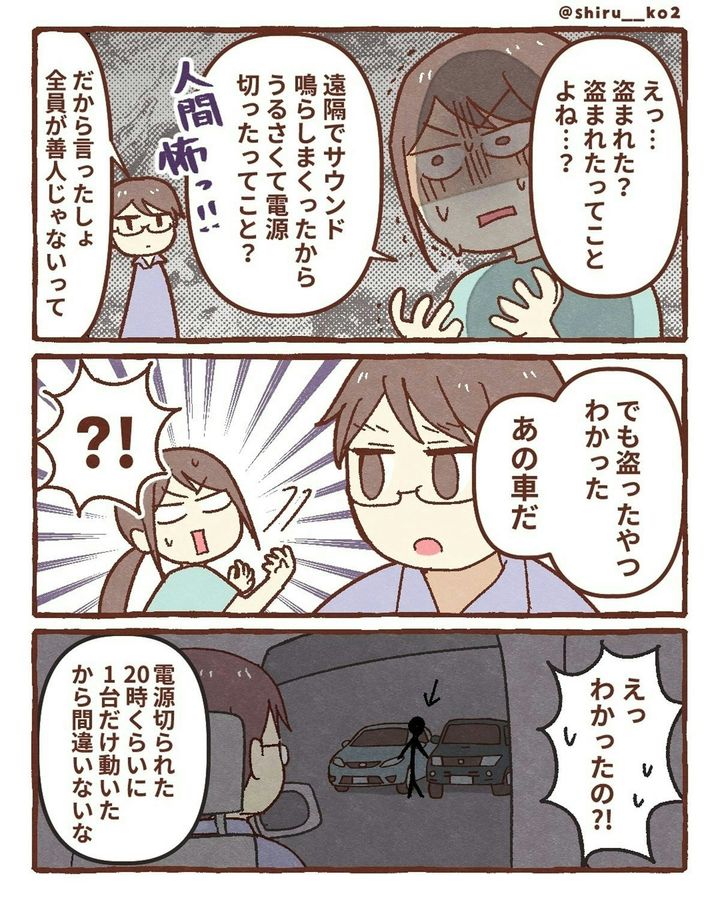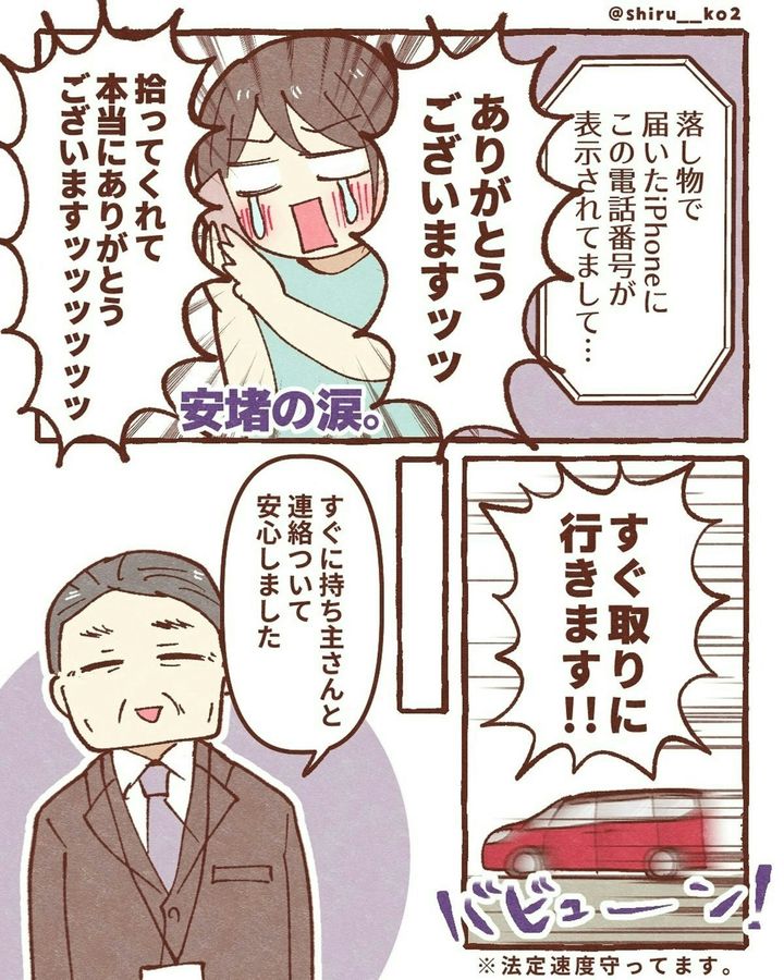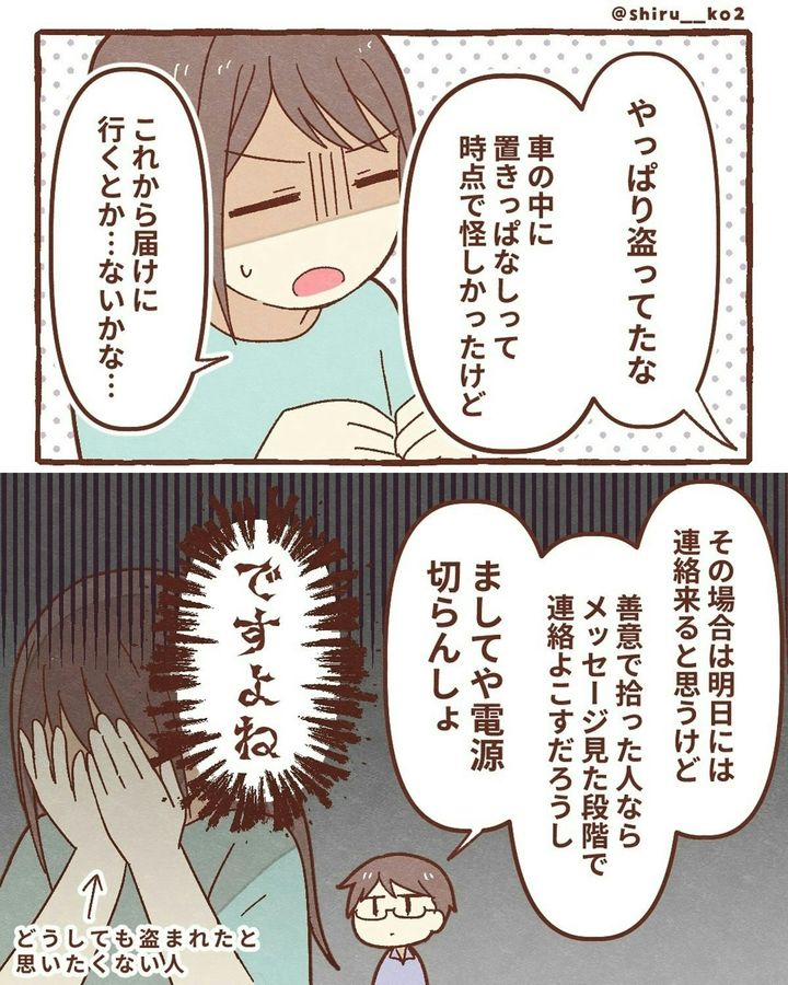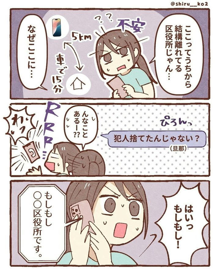 このお話は、著者・しる子(@shiru__ko2)さんがスマホを落としてしまったときの実体験が描かれています。ある日、息子と一緒に公園へ出かけた際、途中の道でスマホを落としてしまいます。探しに戻りますが、見つけることができませんでした。次に、しる子さんは「iPhoneを探す」機能を駆使し、スマホの場所を特定。GPSが示した場所は近所の駐車場でした。その後、夫が夜の駐車場に張り込み。果たして、しる子さんのスマホは…。『スマホ盗まれた』をダイジェスト版でごらんください。
