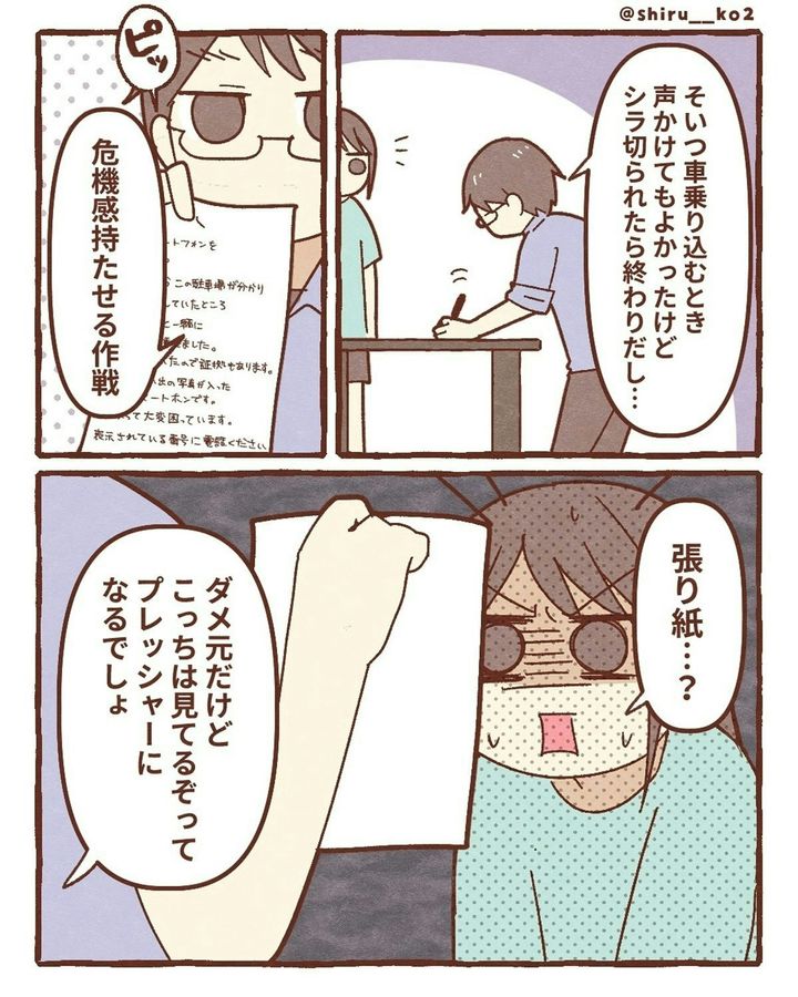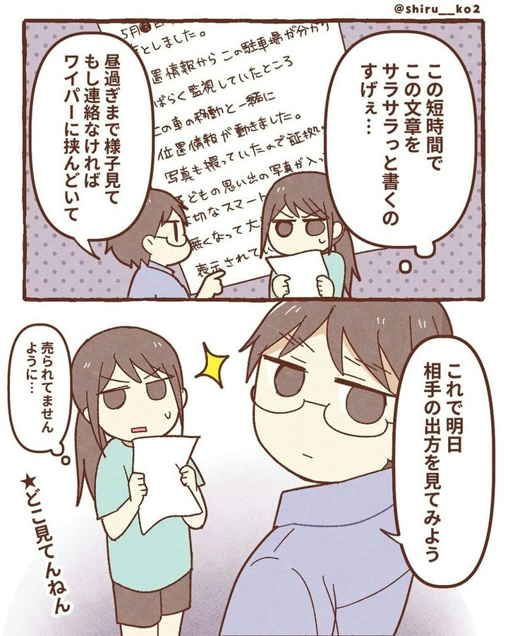 しる子さんが落としてしまったスマホを拾った人物、どうやら善意ではなかったようです。夫の張り込みのおかげで、スマホを拾った人物と車を特定することができました。