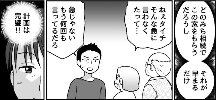タイチが義父に「家を出ていってほしい」と迫ってくれているおかげで、私の計画はうまくいきそうです。義両親はそろって弱気な態度で、強く言い返すこともしません。この家はどうせタイチが継ぐんだから、私たちの主張はそこまでおかしなことではないと思います。