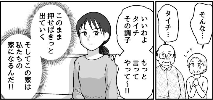 私はタイチをけしかけ、義両親を追い出してもらうよう仕向けました。タイチは毎日のように説得してくれます。義父は病気で気落ちしているし、義母はオロオロするだけで強く言えない人。もう一押しだと思っていました。しかし……。