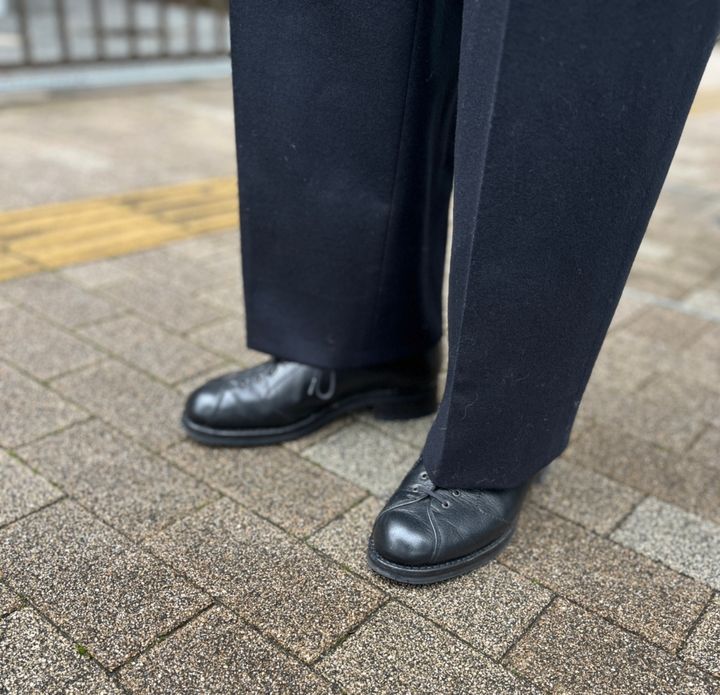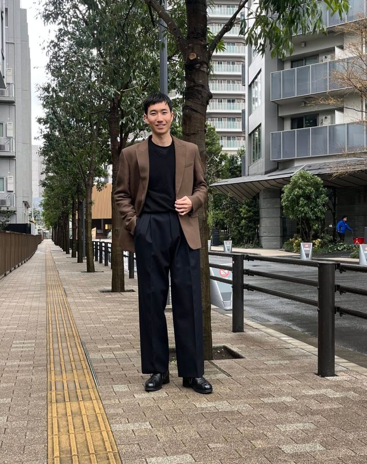 インナーのレイヤードやパンツとのバランスもお見事。「浅Vニットにあえて同色の黒Tをレイヤードしました。これには意図があって、白だとコントラストがつきすぎてTシャツが悪目立ちしてしまうんです。あくまでもジャケットを主役にしたかったので、今回は黒で正解でした。ジャケットがオーバー気味なので、ボトムスも3タックのゆとりのあるシルエットに。そうすることで全体のバランスも整うんです」