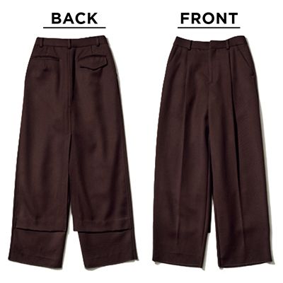 ハリのあるウール生地で仕立てられた、スカートのようなパンツ。きちんと感をキープしつつ、スリット入りで足さばきも良好。動きが出るたびに表情を変える、「ただのパンツ」では満足できない人のためのデザイン。スカート部分にはスリット入りで動きやすい。 ブラウンバックスカートパンツ/チノ(モールド)