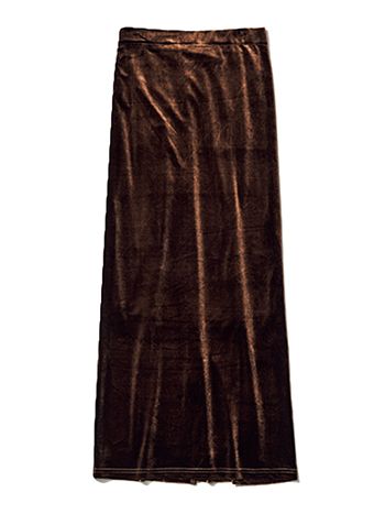 ベロアのリッチな起毛感が動くたびツヤめき、さっぱりとしたフォルムにニュアンスをプラス。素材に厚みがあるぶん、細身のシルエットなのに脚線のアタリを拾いにくくスタイルカバーにも向く1枚。ストレッチ性が高く、ロング丈でも足さばき良好。気になるほっこり感を払拭するバッグスリット。 ブラウンベロアタイトスカート/ユジーヌ(ジーンズ ファクトリー 卸団地本店)