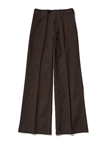 濃いブラウンならワーク感がひかえめでラフな風合いながら上品な佇まい。ひかえめな広がりの絶妙シルエットとハリでスラックスのようなキレイさを実現。 ブラウンフレアチノパンツ(別注)/ディッキーズ(SLOBE IENA 自由が丘店)