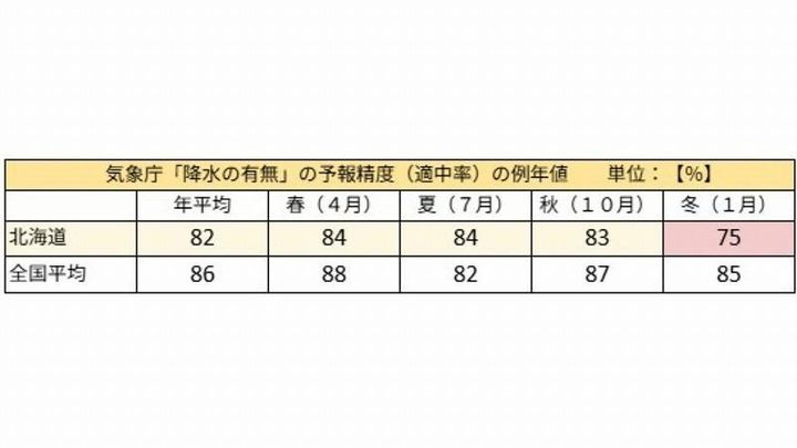 そのデータによると、適中率は全国の年平均が86%なのに対し、北海道の年平均は82%、冬は75%で、全国平均と大きな差があります。