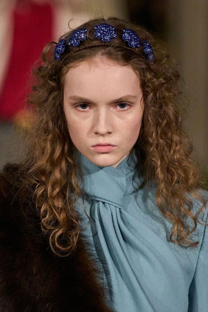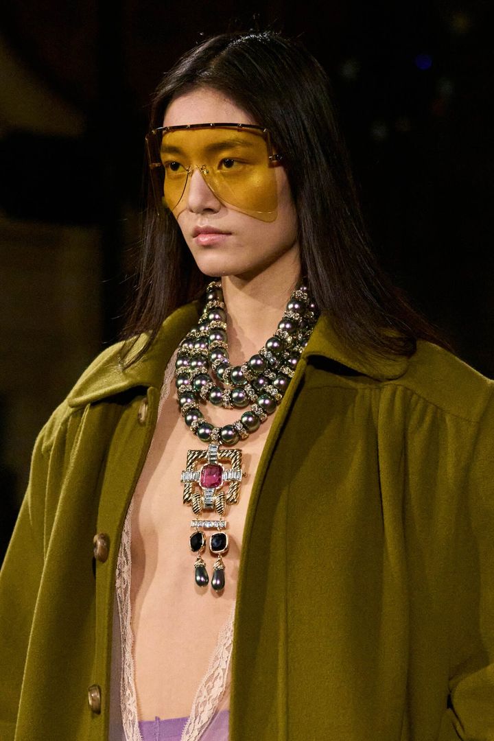 特徴的だったのは、ミケーレらしい装飾性による“ずれ”の演出。存在感のあるジュエリーやヘッドピース、オーバーサイズのサングラスといったスタイリングが、クラシックなシルエットにわずかな違和感を差し込み、均整と逸脱のあいだに独特のバランスを生み出します。
