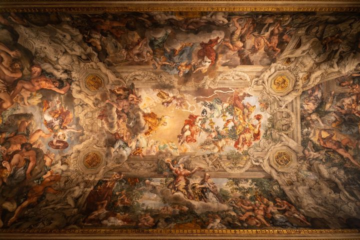 ゲストはショーに先立ち展示空間を巡り、その後、会場となる大広間へと導かれました。天井には、バロック期を代表する画家ピエトロ・ダ・コルトーナによるフレスコ画「神の摂理の勝利」が広がり、バルベリーニ家の紋章である3匹のミツバチが象徴的に描かれています。壮麗なバロック空間の中で、コレクションの世界観へと自然に引き込まれていきます。