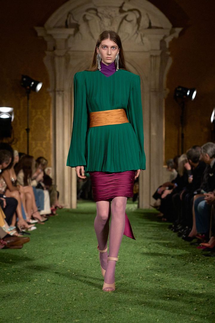 エメラルドグリーンのプリーツトップにワイドなサッシュベルトを合わせたルックや、レースのトップスにドラマチックなドレープスカートを重ねたスタイリングなど、’80年代の空気やアーカイブのコードを色濃く反映しながらも、単なる再現にとどまらず、ミケーレのフィルターを通して再構築されていました。