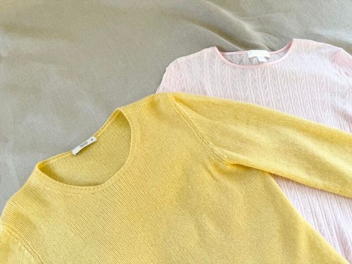ピンク色のシャツは襟ぐりと袖口と裾にパイピングが施されていることで、こんなに可愛いシャツがあろうかという甘い仕上がりになっています。黄色のセーターもカシミヤのふわふわとした手触りと淡い色がたまらなく甘い一着です。