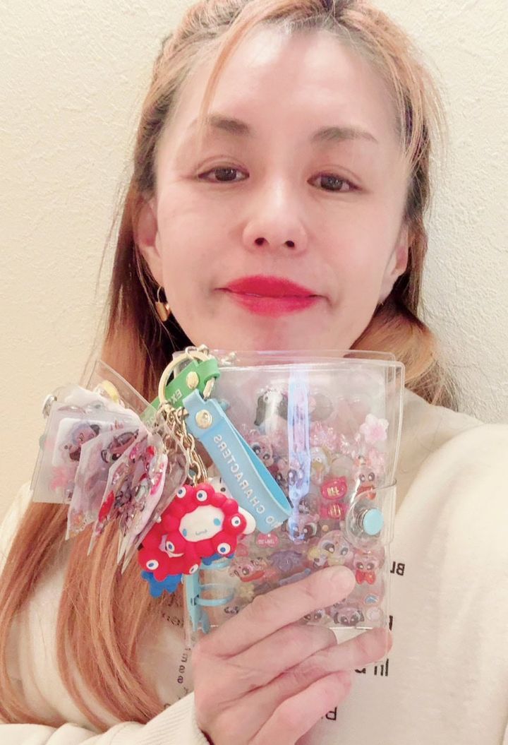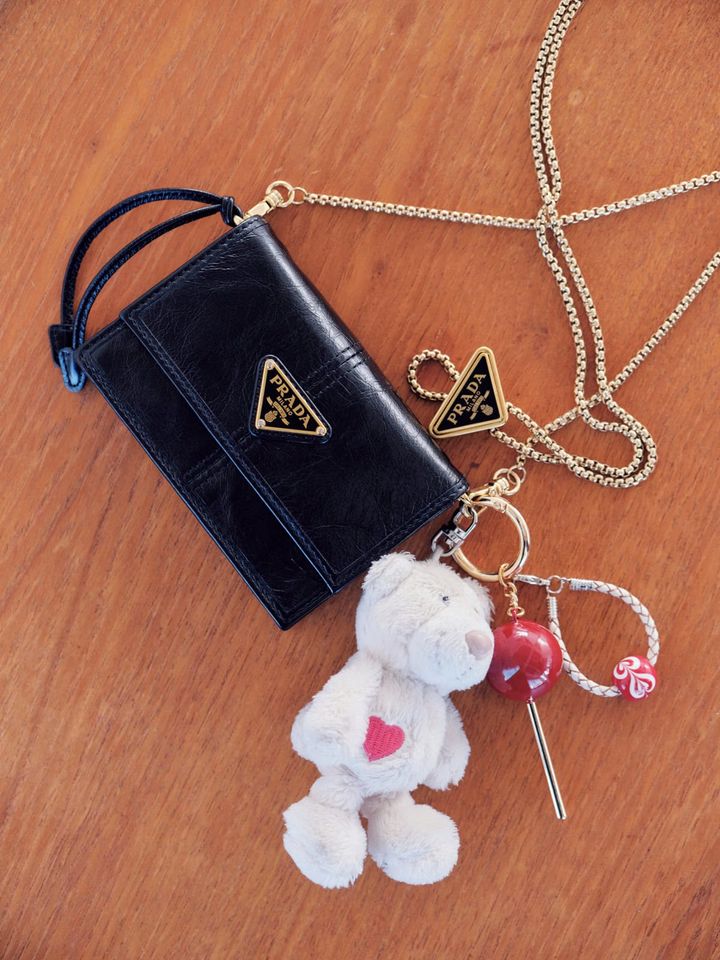 プラダのバッグは、クマちゃんのハートに合わせて赤いチャームで統一感を。シール帳は、ガチャガチャでゲットしたレアなチャームを自慢するようにたくさんつけてます(笑)