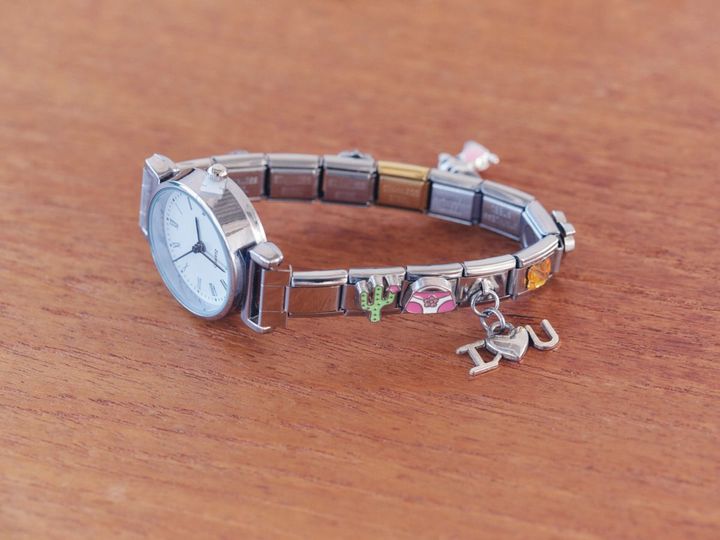 ワイワイハンズでチャームを組み合わせて作った腕時計。ひとつだけゴールドを入れたのがポイント