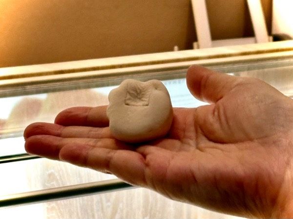 まず、最初は「まひとつサンド(マシュマロサンド)」です!手の形のサブレでマシュマロをサンドし、チョココーティングした後、仕上げに、キャラメリゼしたクルミをトッピングした 、マシュマロサンドです。「まひとつ」は博多弁で「もうひとつ」という意味です。