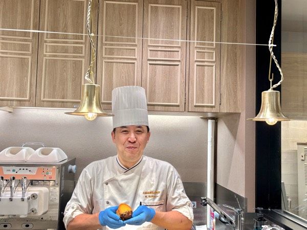 「祝うてサンド」を考案されたパティシエの西村シェフにお話を聞くことができました。 「本当のキャラメルの味や香りをお土産のお菓子に反映するために、いろいろ工夫をかさねました。今回の新商品も、石村萬盛堂の歴史あるマシュマロと本格的なほろ苦キャラメルをバランスを考えながらお店のコンセプトに合わせて組み合わせました」と教えていただきました。 フランスでの修業の経験もあるそうで「ぼくは博多の人間だから、萬盛堂さんのお手伝いをする、ということで入ったんです」と言われていたのが印象的でした。