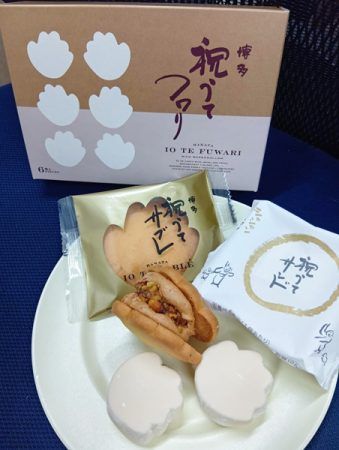 そして、次は新商品でららぽーと福岡店先行販売の「祝うてサブレ」です!「祝うてサンド」でおなじみの、ぷっくりかわいい手のかたちのバターサブレです。このサブレはシンプルですが、バターやバニラビーンズがふんわりと香って、サクッサクッとした食感でした!4枚入り594円からと気軽に買えます。 3種類目はららぽーと福岡店先行販売の「祝うてフワリ」です!祝うてサンドでも使用している焦がしキャラメルクリームとクルミを包み込んだ、手の形のマシュマロです。こちらは6個入り810円。