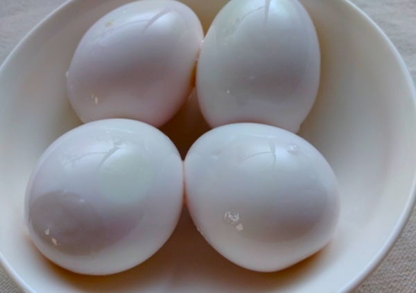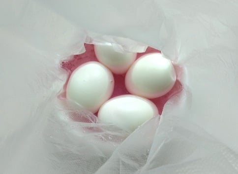 3.ゆでた卵はすぐに冷水でしっかり冷やします。殻をむき、食品用ポリ袋に入れ、漬け液に浸します。卵全体が液に触れるようにしてください。