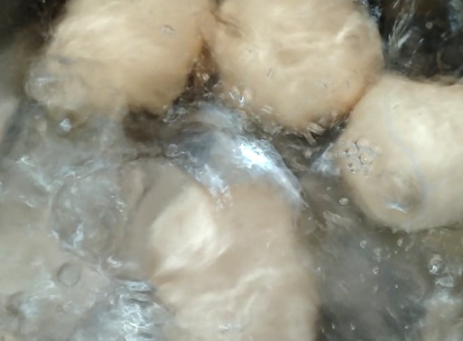 2.卵をゆでます。目安として、沸騰したお湯で約8分ゆでると、やや半熟の状態になります。