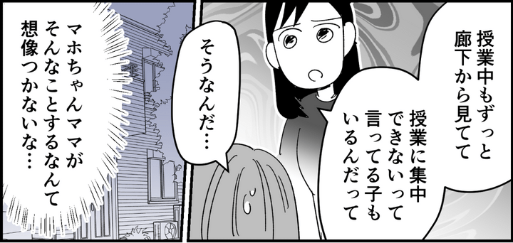 ママ友の話ではシオリちゃんは、お弁当持参で毎日学校に行き、クラスを見張っているそうなのです。シオリちゃんは優しくて穏やかな人。嫌がらせをされても穏便に解決しようとするし、他の子どもにも優しい子煩悩なお母さんです。だからこそ、モンペのような行動をしているシオリちゃんはまったく想像できませんでした。