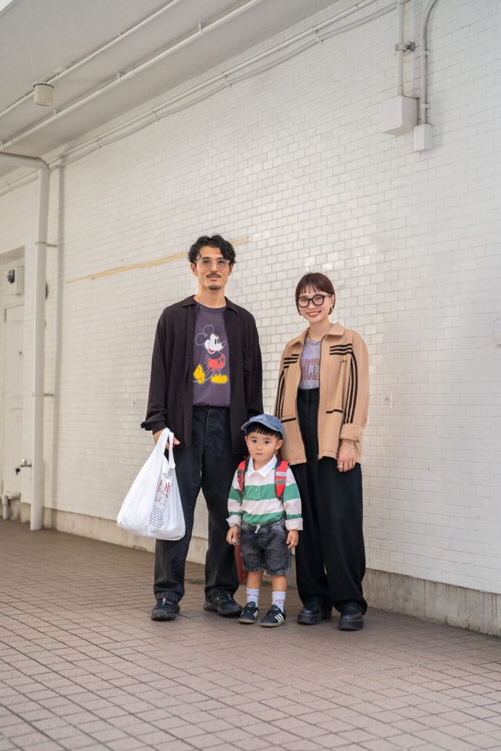 一方息子は、遊び心あるニットを主役に。ネイビーをベースにしたのでどこか落ち着いた印象に見えるのがいいところ、ピンクパンツで春らしい軽やかさもプラスしました。こういう日こそ、無理をしすぎず、心地よく過ごせる服を選びたいなと思います。