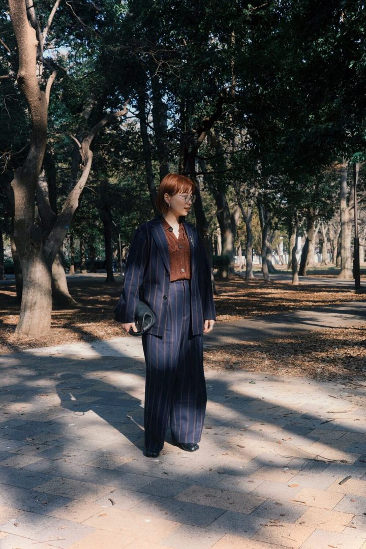 今回のコーデは、私と息子で少しリンクさせたスタイルに。私はネイビーストライプのセットアップに、柔らかいブラウンのインナーを合わせて、きちんと感の中に抜け感を。
