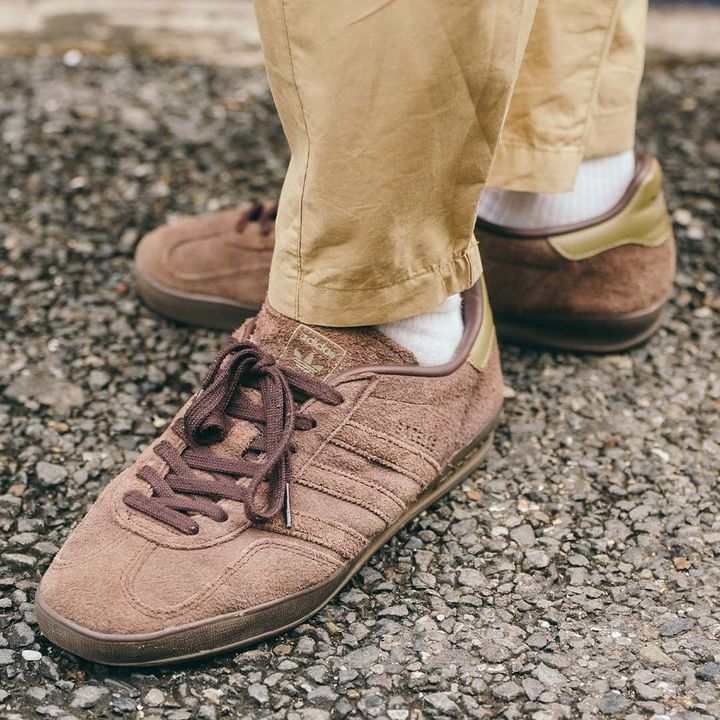 『アディダス』の「ガゼル」はすっきりとしたフォルムが魅力。ベージュのボトムスとブラウンのシューズで、春めくやわらかいトーンに統一!