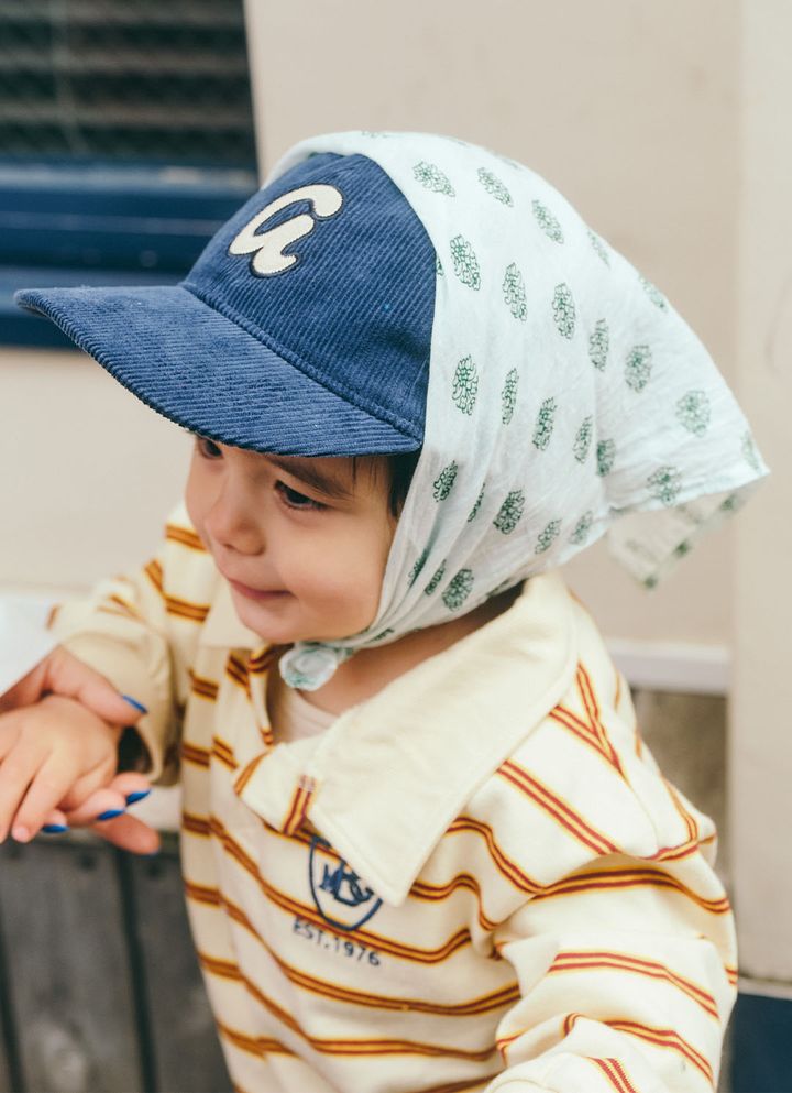 コーデュロイ素材のキャップに、ヴィンテージライクなバンダナをひと巻き。大人顔負けのこなれスタイリングは必見!