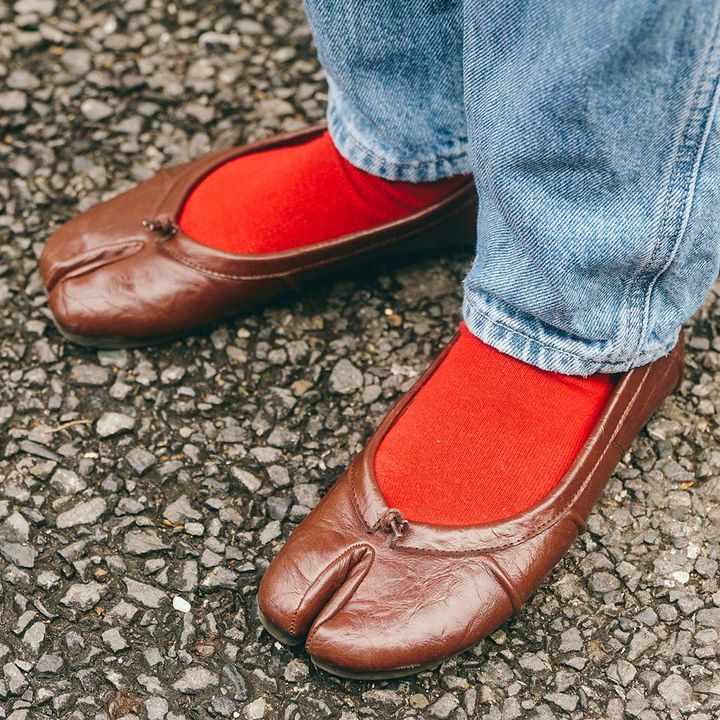 春にぴったりなブラウンレザーの足袋シューズ。ソックスまで色を合わせた、細やかなスタイリング術はさすが!