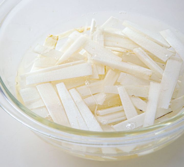 (1)ボールに水2カップと酢を入れて混ぜ合わせ、酢水を作る。うどは長さ5cmに切り、厚めに皮をむく。縦半分に切ってから縦に薄切りにし、酢水のボールに加えて5分ほどおき、アクを抜く。