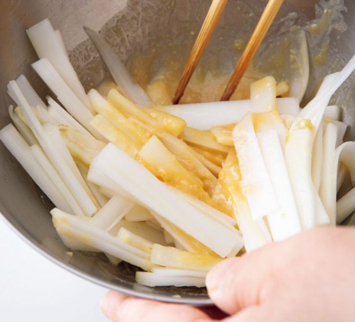 (2)別のボールに〈酢みそ〉の材料を混ぜ合わせる。(1)のうどをざるに上げ、しっかりと水けをきる。酢みそのボールに加え、全体をあえる。