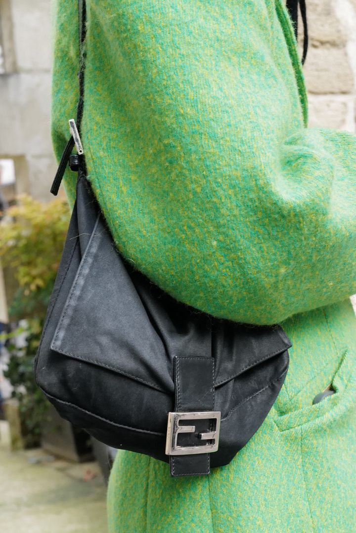 長年愛用している「フェンディ」の“マンマ バケット”は、使うほどにレザーの風合いが出て、こなれ感たっぷりな表情に。「ガニー」のネオングリーンのジャケットを、黒がモードに引き締める。