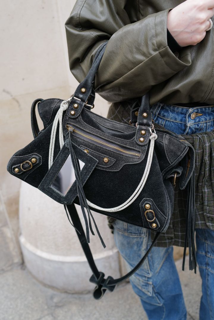 2024年に復活して以来、パリジェンヌの間でも人気急上昇中の「バレンシアガ」の“ル・シティ”。リヤンはスエード素材のブラックを愛用。ビジューチェーンをあしらい、クールな華やぎをのせていた。