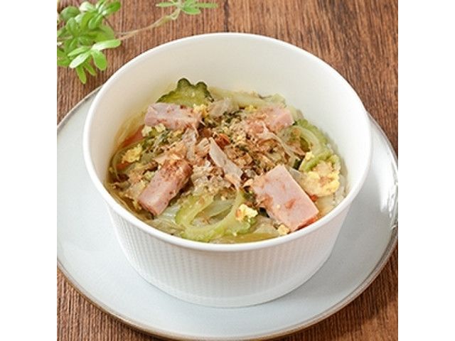 かつおだしの風味が効いた、1/2日分の野菜が摂れるゴーヤのちゃんぷるご飯です。