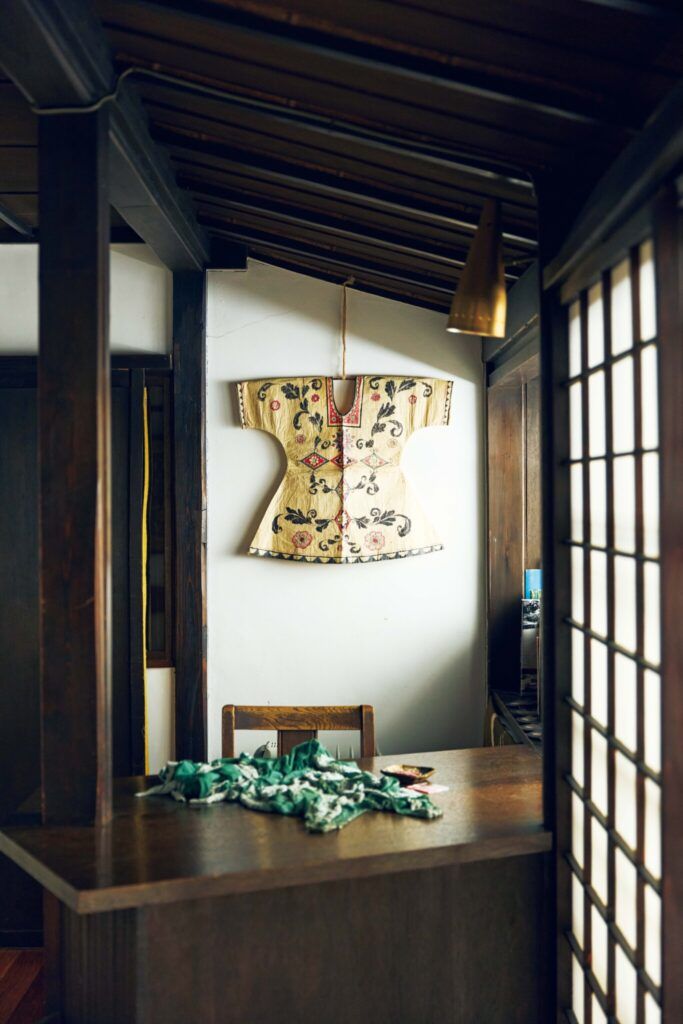 天井から吊るした竹製のポールに通した透け感のある着物は、二人の結婚式の際、ケルシーさんが着用したもの。「アンティークのテーブルクロスを手で縫って、ドレスにしました。特別な思い出が刻まれているものを、あえて日常の風景に溶け込ませています」