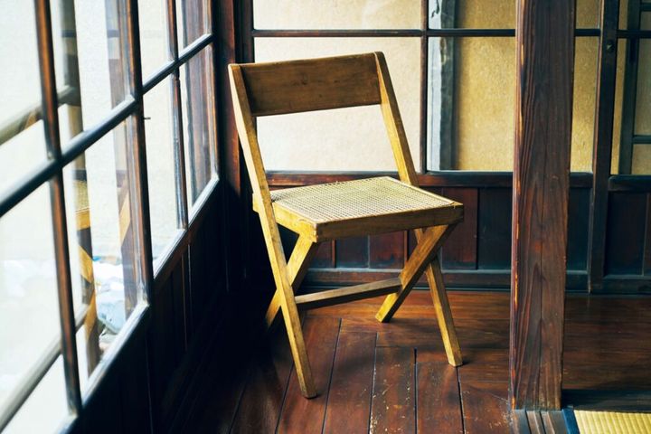V字形の脚のデザインが特徴的なヴィンテージの椅子。「17年くらい前にフランスで立ち寄ったギャラリーで購入しました。僕らが住んでいる古民家にとても合うと思って。ダイニングテーブルとセットで使っていましたが、今は部屋の至る所で愛用しています」