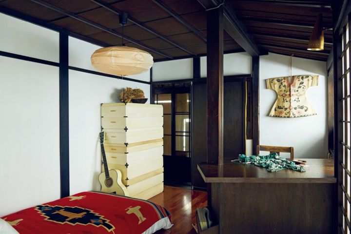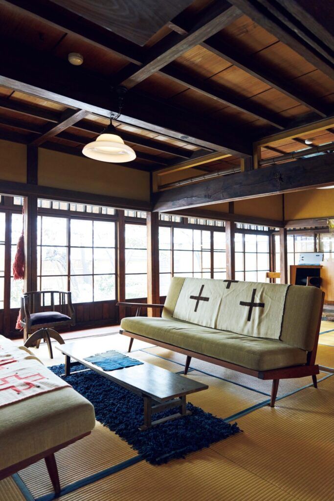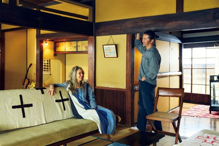 住んで20年ほど経つ、愛着を持って暮らしている江戸時代末期に建てられた茅葺き屋根の家。ヒロキさんとケルシーさんにとって、住まいは、創造のためのエネルギーを育てる場でもある。リビングには、さまざまな国の文化や歴史を感じられるプロダクトが点在する。