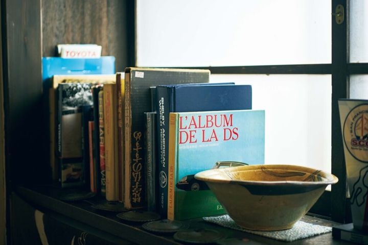 アトリエの窓辺に並ぶのは、アートブックや服づくりの資料など。ヴィンテージカー好きなヒロキさんが愛読する、フランス車〈シトロエン〉の洋書も。「江戸時代の着物のデザイン見本帳を参考にして、服づくりのイメージを膨らませることもあります」