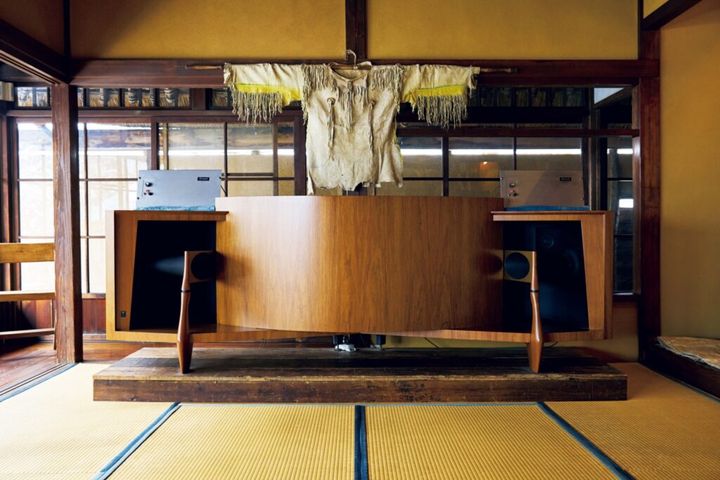 〝木工芸の芸術品〞とスピーカーマニアからの呼び声が高い、ラグジュアリーな家庭用スピーカー。幅2.6mほどのキャビネットに、ステレオ用のホーンユニットを組み込んだデザイン。「音楽は日常にあるもの。アナログで温もりある音色が気に入っています」