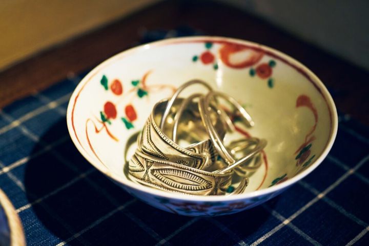 明治か江戸時代後期のものと思われる、インディゴの格子柄の敷布の上に小ぶりの碗を置いた。「敷布は、どこかフランスアンティークを思わせる趣が魅力的。深さがある碗には、僕がよく身に着けているネイティブアメリカンのシルバーバングルを収めています」
