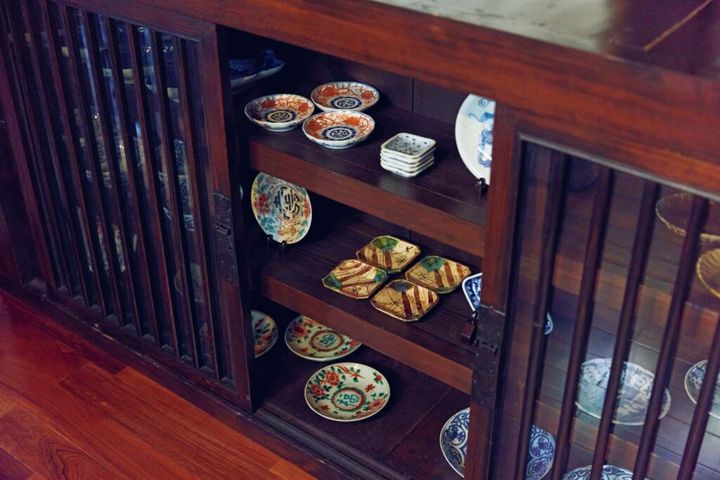 キッチンのそばに置いた食器棚は、日本の古いもの。「ケルシーと結婚した当時、購入しました。ここに並ぶのは、染付の色や絵柄に惹かれ、選び取った骨董の皿。明の時代に作られた『青花』と呼ばれる白地に青の絵付けが美しくて。目玉焼きが、とても映えます」